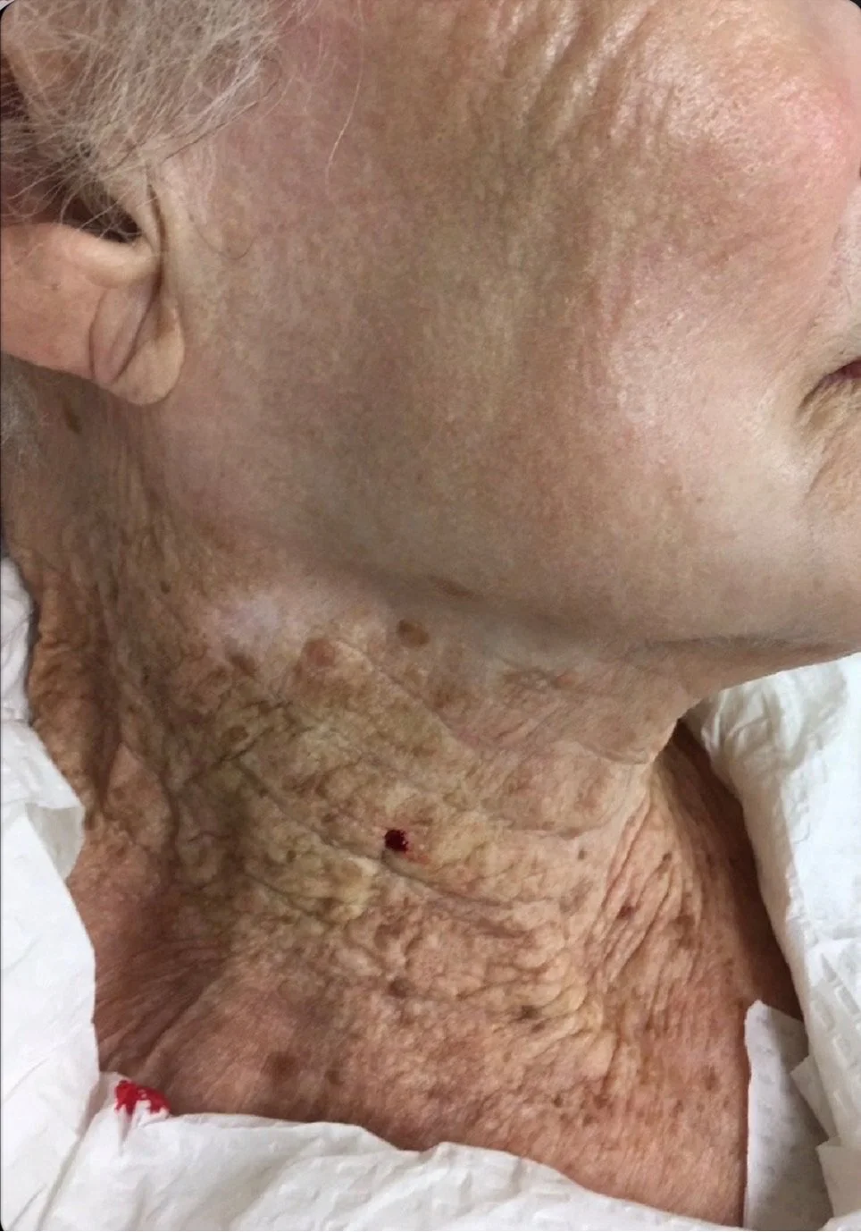 In this case, the face appeared significantly more preserved, while the neck showed advanced signs of photoaging, including creping, deep wrinkling, and discoloration.